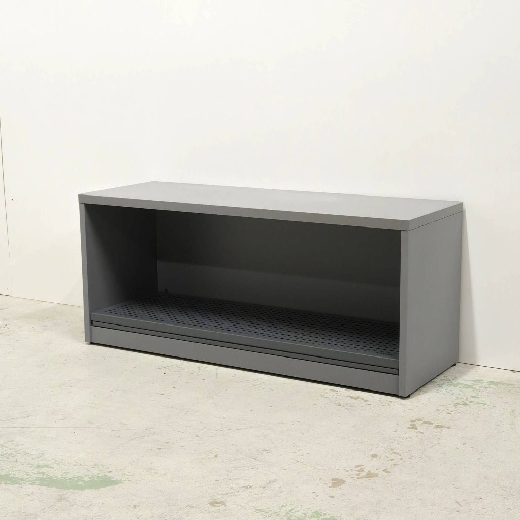 Pukemispenkki S2, teräsrunko, laminaatti kansi ja kenkähylly. Koko 610x350x350. 1-kenkähylly hopean harmaa vakiona.